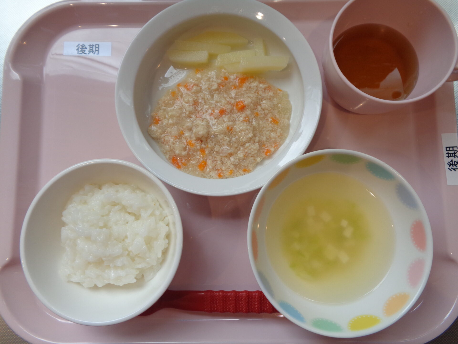 2025.09.25 給食写真 9月 25日(木) 【普通食】・ご飯・豚のしょうが焼き・ひじきポテト・麩の味噌汁 【離乳食・後期】・軟飯・鶏肉と玉ねぎの煮物・じゃが芋スティック・豆腐の味噌汁 一覧へ戻る