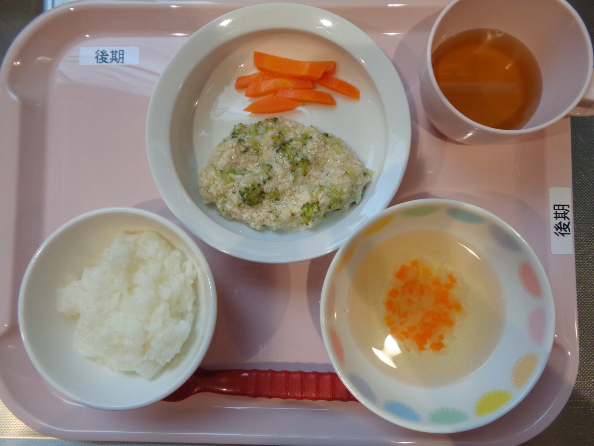 2025.09.29 給食写真 9月 29日(月) 【普通食】・ご飯・鶏のカレー風味焼き・ちくわサラダ・根菜スープ 【離乳食・後期】・軟飯・鶏肉とブロッコリーのうま煮・にんじんスティック・大根スープ 一覧へ戻る