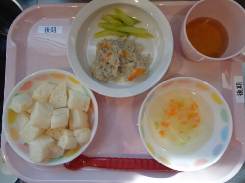 【離乳食・後期】・ロールパン・しらすとじゃが芋の煮物・アスパラスティック・ポトフ風スープ