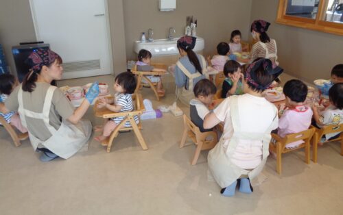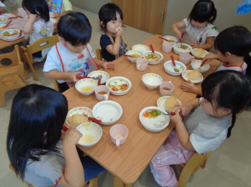 午前中の活動では、散歩や外遊びをした子どもたち。たくさん遊んでおなかがすいていたようでモリモリ食べていましたよ。