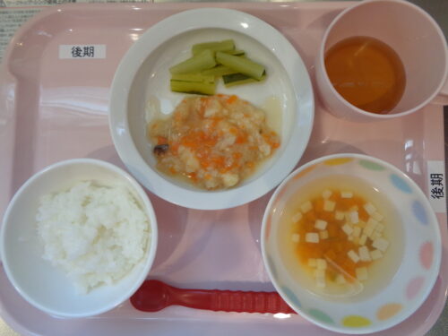 2025.10.01 給食写真 10月 1日(水) 【普通食】・麦ご飯・さわらの西京焼き・もやしと錦糸卵のサラダ・かぼちゃのすまし汁・パイン缶 【離乳食・後期】・軟飯・カレイの味噌煮・きゅうりスティック・豆腐のすまし汁 一覧へ戻る