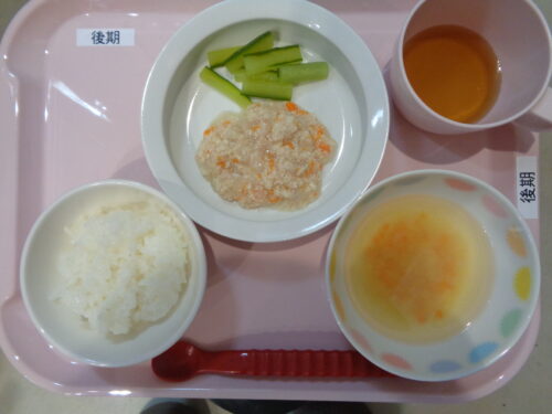 【離乳食・後期】・軟飯・鶏肉と野菜の煮物・きゅうりスティック・大根の味噌汁