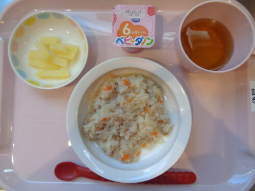 【離乳食・後期】・豚肉と野菜の雑炊・じゃが芋スティック・ベビーヨーグルト