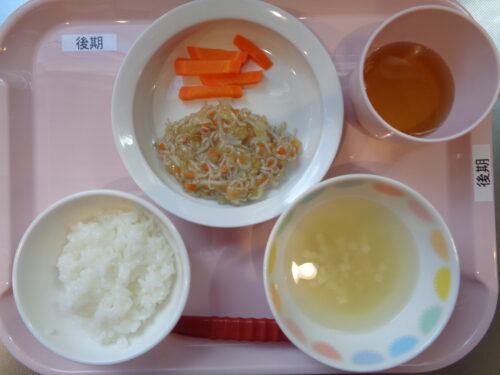 【離乳食・後期】・軟飯・しらすと白菜の煮物・にんじんスティック・豆腐の味噌汁