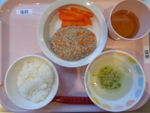 2025.10.10 給食写真 10月 10日(金) 【普通食】・ミートソーススパゲティ・ブロッコリーと人参のサラダ・コーンスープ 【離乳食・後期】・軟飯・豚肉のコンソメ煮・にんじんスティック・ブロッコリースープ 一覧へ戻る