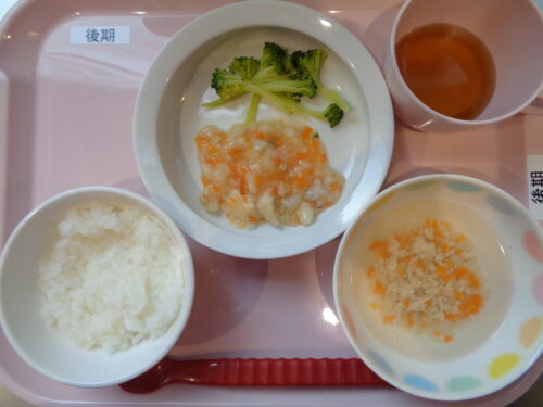 2025.10.23 給食写真 10月 22日(水) 【普通食】・ご飯・あじの梅味噌焼き・ブロッコリーの胡麻和え・けんちん汁 【離乳食・後期】・軟飯・たらの味噌煮・ブロッコリースティック・けんちん汁 一覧へ戻る