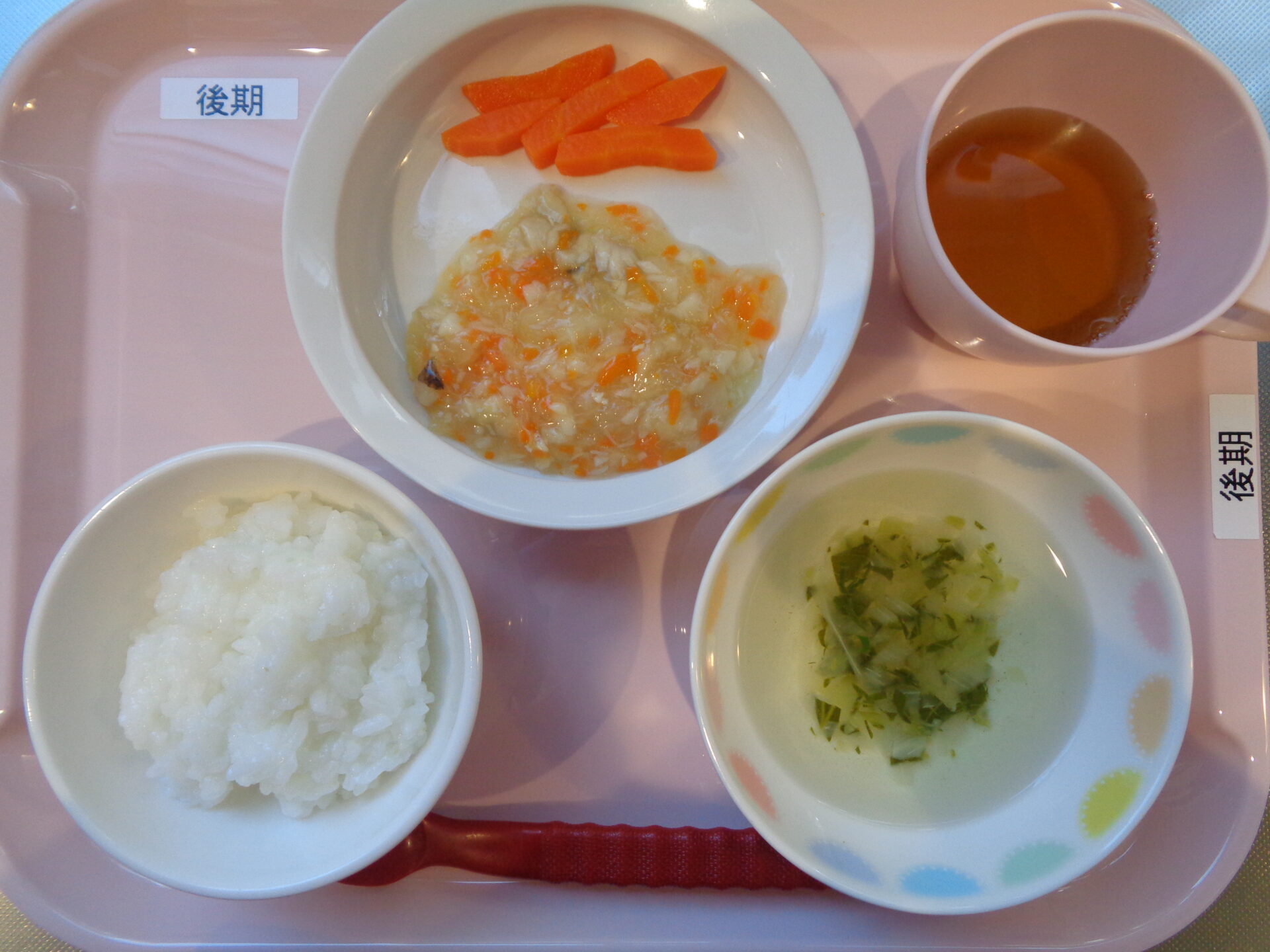 2025.10.24 給食写真 10月 24日(金) 【普通食】・ご飯・さわらのゆかり焼き・切り干し大根の煮物・チンゲン菜のすまし汁 【離乳食・後期】・軟飯・カレイのコンソメ煮・にんじんスティック・チンゲン菜スープ 一覧へ戻る