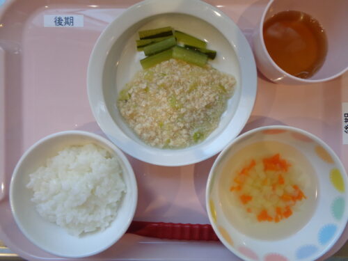 【離乳食・後期】・軟飯・鶏肉とキャベツの煮物・きゅうりスティック・ポトフ風スープ