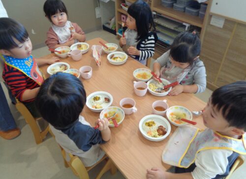 ・今日は10月生まれの誕生会!みんなでお祝いして美味しい給食をいただきました。