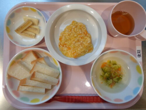 2025.10.31 給食写真 10月 31日(金)~ハロウィンメニュー~ 【普通食】・ロールパン・ハロウィンシチュー・ブロッコリーサラダ・バナナ 【離乳食・後期】・食パン・鶏肉とかぼちゃの煮物・ブロッコリースープ・バナナ 一覧へ戻る