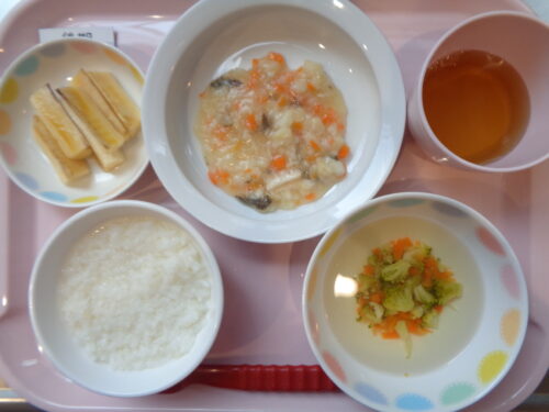 2025.11.11 給食写真 11月 11日(火) 【普通食】・ご飯・さばの塩焼き・アスパラのごま和え・けんちん汁(さつま芋掘りの芋入り)・バナナ 【離乳食・後期】・軟飯・カレイと人参の煮物・ブロッコリースープ・バナナ 一覧へ戻る