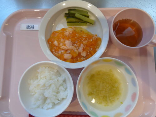 2025.11.14 給食写真 11月 14日(金) 【普通食】・鮭の照り焼き・かぼちゃサラダ・キャベツのすまし汁 【離乳食・後期】・軟飯・鮭とかぼちゃのコンソメ煮・きゅうりスティック・キャベツのすまし汁 一覧へ戻る
