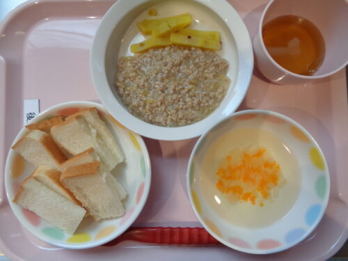 2025.11.26 給食写真 11月 26日(水) 【普通食】・ロールパン・ポークチャップ・さつまいもサラダ・白菜のミルクスープ 【離乳食・後期】・食パン・豚肉と白菜のコンソメ煮・さつまいもスティック・玉ねぎスープ 一覧へ戻る