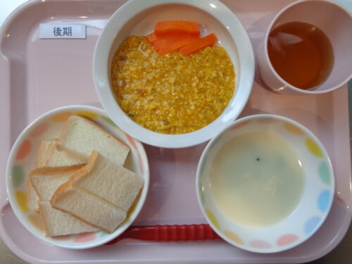 2025.12.19 給食写真 12月 19日(金)~誕生会メニュー~ 【普通食】・ロールパン・鶏のから揚げ・大根とブロッコリーのサラダ・コーンスープ・ヤクルト 【離乳食・後期】・食パン・鶏肉とかぼちゃの煮物・にんじんスティック・豆乳スープ 一覧へ戻る
