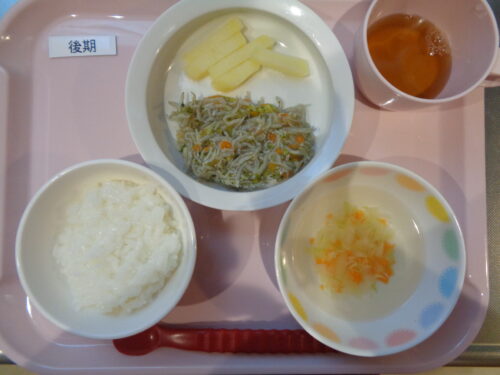 【離乳食・後期】・軟飯・しらすとブロッコリーの洋風煮・じゃが芋スティック・キャベツスープ・ベビーヨーグルト
