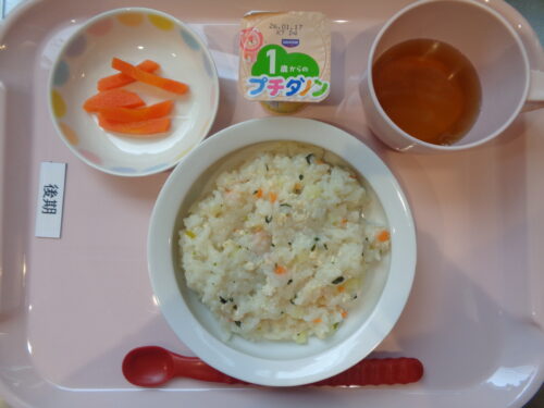 【離乳食・後期】・鶏肉とじゃが芋の雑炊・にんじんスティック・プレーンヨーグルト
