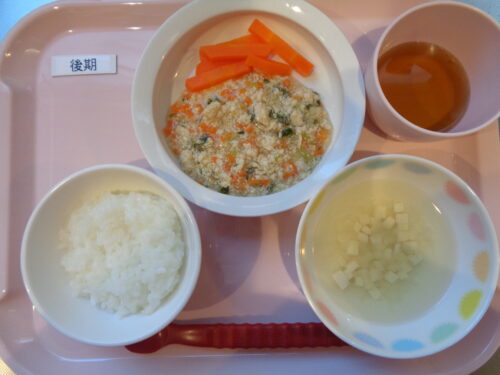 2026.01.06 給食写真 1月6日(火) 【普通食】・ご飯・鶏肉の塩こうじ焼き・千草和え・豆腐のすまし汁 【離乳食・後期】・軟飯・鶏肉とチンゲン菜の中華煮・にんじんスティック・豆腐のすまし汁 一覧へ戻る