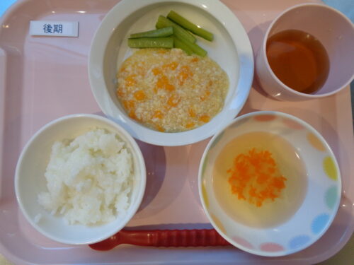 【離乳食・後期】・軟飯・鶏肉とかぼちゃの煮物・きゅうりスティック・大根スープ