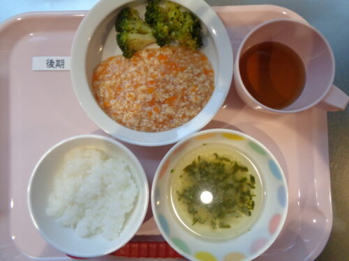 2026.01.20 給食写真 1月20日(火) 【普通食】・ミートソーススパゲティ・ブロッコリーサラダ・野菜スープ 【離乳食・後期】・軟飯・鶏肉のトマト煮・ブロッコリースティック・チンゲン菜スープ 一覧へ戻る