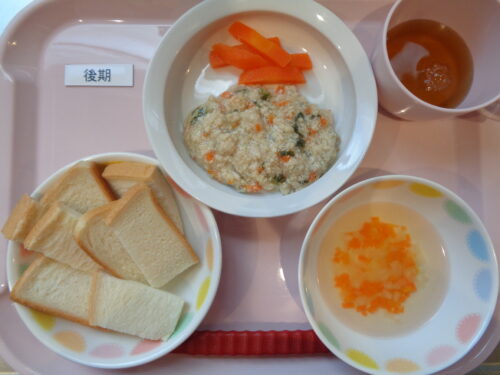2026.01.29 給食写真 1月29日(木) 【普通食】・黒糖ロール・ガーリックチキン・スパゲティサラダ・野菜スープ 【離乳食・後期】・食パン・鶏肉とチンゲン菜の洋風煮・にんじんスティック・大根のコンソメスープ 一覧へ戻る