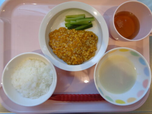 2026.01.30 給食写真 1月30日(金)~誕生会メニュー~ 【普通食】・ふりかけご飯・ハンバーグ・人参ときゅうりのマリネ・コーンスープ・ヤクルト 【離乳食・後期】・軟飯・豚肉とかぼちゃの煮物・きゅうりスティック・豆乳スープ 一覧へ戻る