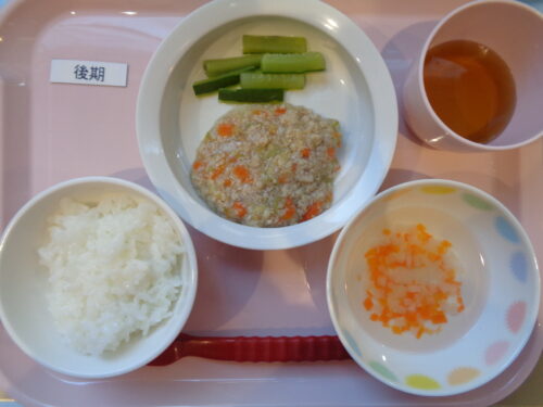 2026.02.04 給食写真 2月4日(水) 【普通食】・ご飯・肉野菜炒め・ビーフンサラダ・わかめスープ 【離乳食・後期】・軟飯・豚肉とキャベツの煮物・きゅうりスティック・大根の中華スープ 一覧へ戻る
