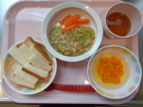 2026.02.06 給食写真 2月6日(金) 【普通食】 ・食パン ・鮭のさっぱりレモン焼き ・かぼちゃのサラダ ・セロリスープ 【後期食】 ・食パン ・鮭とブロッコリーの中華煮 ・にんじんスティック ・かぼちゃスープ 一覧へ戻る