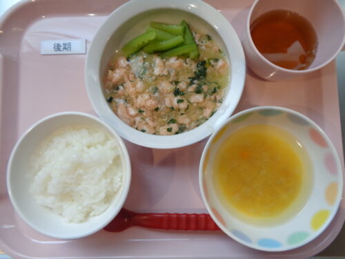 2026.02.16 給食写真 2月16日(月) 【普通食】 ・ご飯 ・鮭のサクサク焼き ・春雨サラダ ・かぼちゃの味噌汁 【後期食】 ・軟飯 ・鮭とほうれん草の煮物 ・きゅうりスティック ・かぼちゃの味噌汁 一覧へ戻る