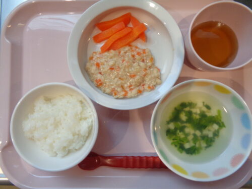 【離乳食・後期】・軟飯・鶏肉と人参の煮物・にんじんスティック・ほうれん草スープ