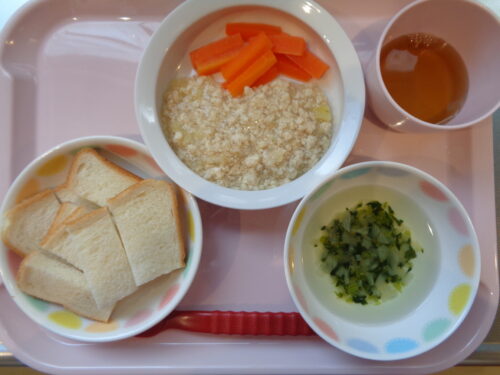 2026.03.05 給食写真 3月5日(木) 【普通食】・ロールパン・バーベキューチキン・ツナサラダ・ミルクスープ 【離乳食・後期】・食パン・鶏肉とじゃが芋の煮物・にんじんスティック・玉ねぎスープ 一覧へ戻る