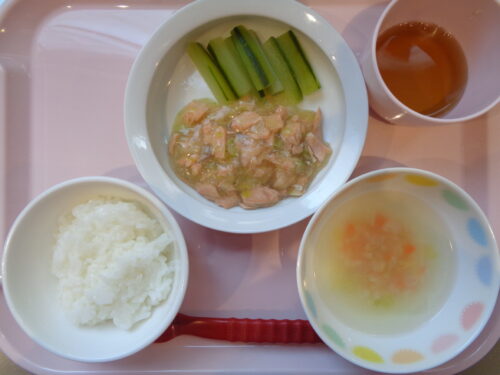 【離乳食・後期】・軟飯・鮭とキャベツの煮物・きゅうりスティック・白菜の味噌汁