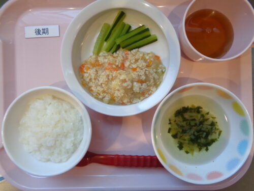 2026.03.11 給食写真 3月11日(水) 【普通食】・ご飯・豆腐のふんわり揚げ・マカロニサラダ・かきたま汁 【離乳食・後期】・軟飯・鶏肉とキャベツの煮物・きゅうりスティック・小松菜のスープ 一覧へ戻る