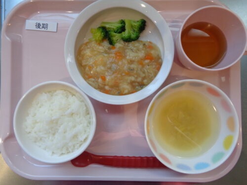 2026.04.03 給食写真 4月3日(金) 【普通食】・ご飯・カレイの照り焼き・ブロッコリーサラダ・春キャベツの味噌汁 【離乳食・後期】・軟飯・カレイと人参の煮物・ブロッコリースティック・春キャベツの味噌汁 一覧へ戻る