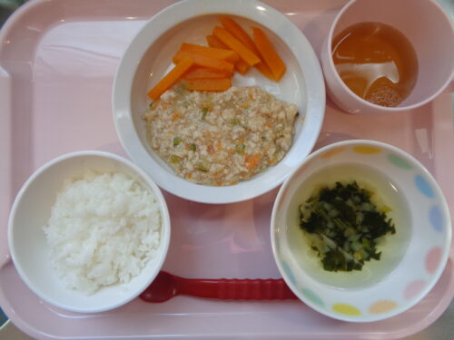 2026.04.07 給食写真 4月7日(火) 【普通食】・ミートソーススパゲティ・かぼちゃサラダ・鶏肉と野菜のスープ 【離乳食・後期】・軟飯・豚肉と野菜の中華煮・かぼちゃスティック・ほうれん草スープ 一覧へ戻る