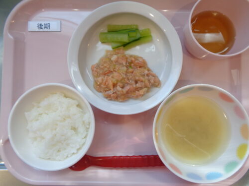 2026.04.08 給食写真 4月8日(水) 【普通食】・ご飯・鮭のコーンクリーム焼き・白菜のおひたし・里芋の味噌汁 【離乳食・後期】・軟飯・鮭と白菜の煮物・きゅうりスティック・里芋の味噌汁 一覧へ戻る