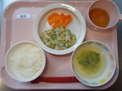 2026.04.14 給食写真 4月14日(火) 【普通食】・ご飯・あじの蒲焼・ブロッコリーの黒ごま和え・味噌汁 【離乳食・後期】・軟飯・カレイとブロッコリーの煮物・にんじんスティック・チンゲン菜の味噌汁 一覧へ戻る